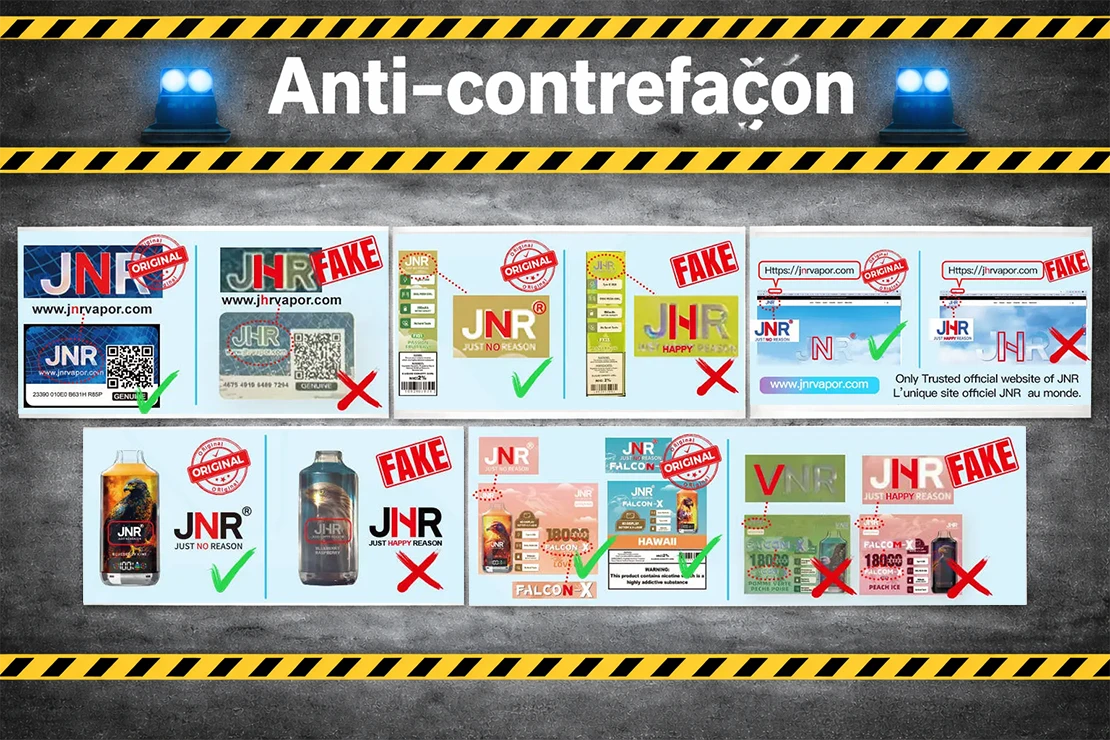 Réponse : La série JNR Falcon utilise QR/code de série et comparaison du packaging, vérifier la forme du « N » comme expliqué dans la section 9.